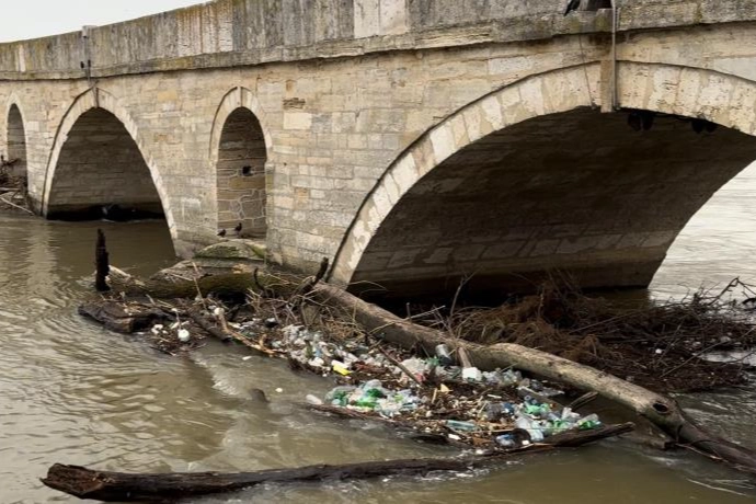 Nehrin üst havzasından sürüklenen ağaç gövdeleri, dev tomruklar ve evsel atıklar, kentin simgelerinden tarihi Meriç Köprüsü’nün kemerlerinde birikti. Suyun yüzeyini kaplayan plastik şişe ve kirlilik tabakası, tarihi köprünün ayaklarında adeta bir set oluşturdu.