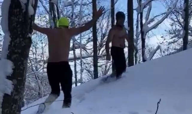 Bursa’da iki arkadaş dondurucu soğukta kar yağışını fırsata çevirdi. Uludağ'ın eteklerindeki ormanlık alanda kar banyosu yapan iki kafadar soğuğa meydan okudu.