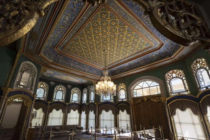 Dronun kasrın giriş kapısından başlayarak kaydettiği görüntülerde, Divanhane, Arz Odası, ünlü kurum ve kuruluşları tarafından hediye edilen müzik aletlerinden oluşan "Türk çalgıları sergisi" yer aldı.