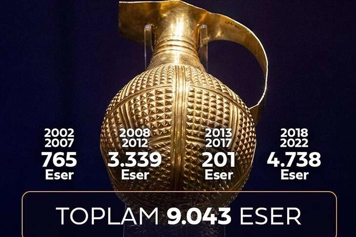 Paylaşımdaki görselde, 2002-2007 yıllarında 765, 2008-2012'de 3 bin 339, 2013-2017'de 201 ve 2018-2022 yıllarında ise 4 bin 738 eserin Türkiye'ye getirildiği bilgisine yer verildi.
