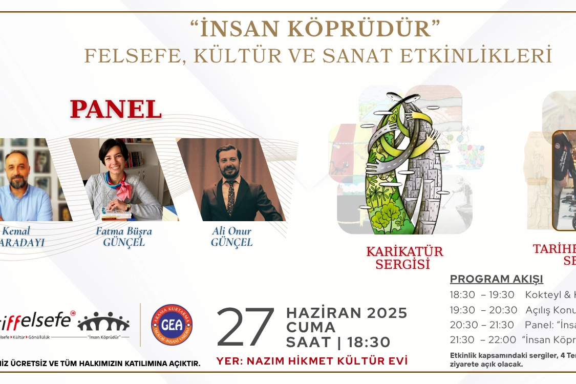 Etkinlik, saat 20.30’da başlayacak panel ile devam edecek. “İnsan Köprüdür” kitabının yazarlarından Sosyolog-Yazar Kemal Karadayı, Av. Ali Onur Günçel ve Fatma Büşra Günçel’in konuşmacı olarak katılacağı panelin ardından yazarlarla imza buluşması düzenlenecek. Sergiler, 27 Haziran – 4 Temmuz 2025 tarihleri arasında ziyaret edilebilecek. Etkinlik ücretsiz olup tüm halk davetlidir.
