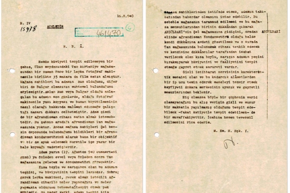 Milli İstihbarat Teşkilatı, resmi sitesi üzerinden belge paylaşımlarına devam ediyor. Tarihe ışık tutmak amacıyla paylaşılan son belge ise yabancı bir istihbarat şüphelisinin Ankara'nın Ulus semtinde faaliyetlerinin açıklığa kavuşturulması amacıyla MAH Riyasetinden Ankara B Amirliğine 16 Ağustos 1940 tarihli talimat oldu. Paylaşılan belgede kimliği henüz tespit edilmeyen ve Rus veya Bulgar olduğu anlaşılan bir şahsın Ulus meydanındaki Tan kırtasiyesinden bir fotoğraf makinesi alması, aldığı fotoğraf makinesi ile yazı kopyası ve bunun büyütülmesinin nasıl olacağı hakkında bilgi edinmeye çalışmasının dikkati çektiği belirtiliyor. Belgede, şüpheli şahsın bir fotoğrafın büyütülerek çıkarılması için kullanılan agrandisman cihazı satın almak istemesi ve cihazın Tan kırtasiyesinde olmadığı bilgisi yer aldı. Şüphelinin yarın (17 Ağustos 1940) öğleden önce veya sonra kırtasiyeye gelip cihazı göreceği bilgisi de ayrıca belgede yer aldı. Kısa boylu ve sarışınca olan şüphelinin teşhisi ve kimliğinin tespiti lazım olduğu belirtilen belgede, şüphelinin aldığı fotoğraf makinesi ile almak istediği agrandisman cihazı ile neler yapmakta olduğu ve neler yapacağının tespitinin ehemmiyetine vurgu yapıldı.
