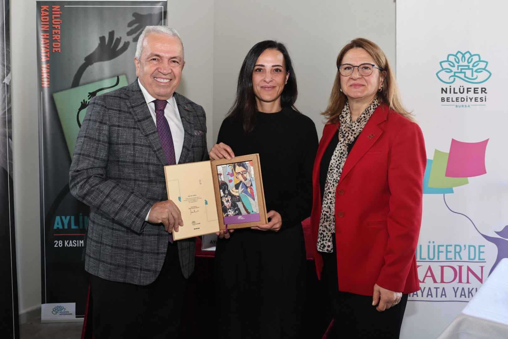 Etkinlik sonunda, Nilüfer Belediye Başkanı Şadi Özdemir yazar Aylin Balboa’ya teşekkür etti. Aylin Balboa, etkinlikte kadınlar için kitaplarını da imzaladı.