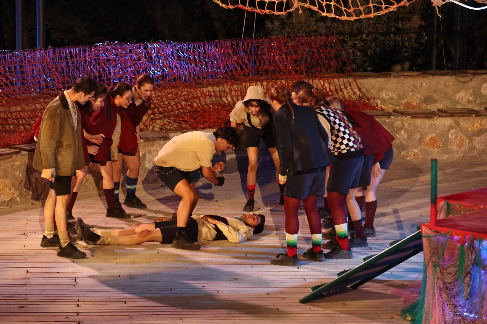 Ocak ayından bu yana süren yoğun eğitim sürecinin ardından sahneye çıkan genç oyuncular, uçak kazası sonucu ıssız bir adaya düşen çocukların uygarlıktan uzak kaldıkça içlerindeki ilkel dürtülerle yüzleşmelerini konu alan oyunu etkileyici bir performansla sundu.
