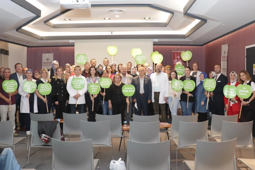 Dünya Diyabet Günü etkinlikleri çerçevesinde dikkat çekmek ve farkındalık oluşturmak için bir dizi etkinliğe imza atan Hayat Hastanesi, düzenlediği seminerle şeker hastalığının sağlığa olan etkinlerine vurgu yaptı. Hayat Hastanesi’nin toplantı salonunda organize edilen seminere; Hayat Hastanesi Başhekimi Dr. Fatih Özkul, Yönetim Kurulu Başkan Yardımcısı Betül Kabalar, Yönetim Kurulu Üyesi İbrahim Özkul, Dahiliye Uzmanları Dr. Ali Nizamoğlu, Dr.Muhittin Pekuz, Dr. Mehmet Erdoğmuş, Diyetisyen Fatma Hallaç Uslu ve çok sayıda vatandaş katıldı. Diyabet konusunda insanları bilinçlendirmek ve diyabete karşı verilen mücadeleye destek olmak için çalıştıklarını ifade eden Hayat Hastanesi Başhekimi Dr.Fatih Özkul, “Hayat Hastanesi olarak ülkemizde gün geçtikçe yaygınlaşan diyabete karşı insanlarımızı bilinçlendirmek için çalışıyoruz. Diyabette önlenebilir komplikasyon dediğimiz sorunların engellenmesi açısından insanları bilgilendirmek, takiplerin düzgün ve doğru yapılmasını sağlamak hayati önem taşıyor. Sevdiklerimize sağlıklı bir yaşam inşa etmenin de sorumluluğuyla bugün bu semineri düzenledik” dedi.