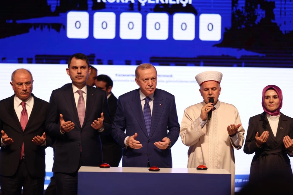Türkiye genelinde 500 bin sosyal konutun inşa edileceği ‘Yüzyılın Konut Projesi’ kapsamında, Cumhurbaşkanı Recep Tayyip Erdoğan’ın katılımıyla Ankara’da Beştepe Millet Kongre ve Kültür Merkezi'nde ‘Ev Sahibi Türkiye’ Kura Çekim Töreni düzenlendi. Noter huzurunda 31 bin 73 konutun hak sahiplerinin belirlendiği törene Çevre, Şehircilik ve İklim Değişikliği Bakanı Murat Kurum, diğer kabine üyeleri, milletvekilleri ve vatandaşlar katıldı. "Cumhuriyet tarihinin en kapsamlı şehircilik hamlesi" Törende konuşan Bakan Kurum, "Bugün, milletin evinde, milletin yuvaları için bir aradayız. Cumhuriyet tarihinin en kapsamlı şehircilik hamlesinin, en kıymetli adımlarından birini atıyoruz" dedi. 6 Şubat depremlerinin ardından 455 bin konutun inşa edilmesiyle tamamlanan Asrın İnşa Seferberliği’nin, 500 bin sosyal konutun inşa edileceği ‘Yüzyılın Konut Projesi’ne örnek teşkil ettiğine işaret eden Bakan Kurum, "Yüzyılın Konut Projesi, 6 Şubat sonrası başlattığımız asrın inşasının 81 ildeki yansımasıdır. Herkesin kabulüdür ki, bu süreçte devletimiz asrın inşasıyla; tüm dünyaya örnek olacak bir dirayeti ortaya koydu. Deprem bölgesiyle bağımızı bir an olsun koparmadan, adeta bir şefkat koridoru oluşturduk. Ve hamdolsun, yaralarımızı sarmayı da yeniden dimdik ayağa kalkmayı da milletimizle birlikte başardık. 11 ilde, 4 bin 333 köyde, 3 bin 481 şantiyede gece gündüz çalıştık. 200 bin mimar, mühendis ve işçi kardeşimizle beraber, emsalsiz bir yeniden inşa seferberliğine imza attık. Türkiye Cumhuriyeti’nin gücü, Türk milletinin dualarıyla; dile kolay, tam 455 bin konutumuzu alnımızın akıyla tamamladık" ifadelerini kullandı.