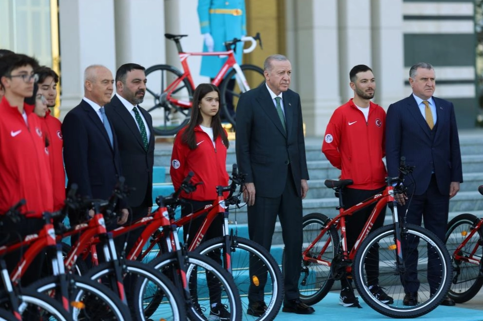 Bisikletçilere çeşitli hediyeler veren Cumhurbaşkanı Erdoğan, Gençlik ve Spor Bakanı, Türkiye Bisiklet Federasyonu yönetimi ve sporcularla hatıra fotoğrafı çektirdi.