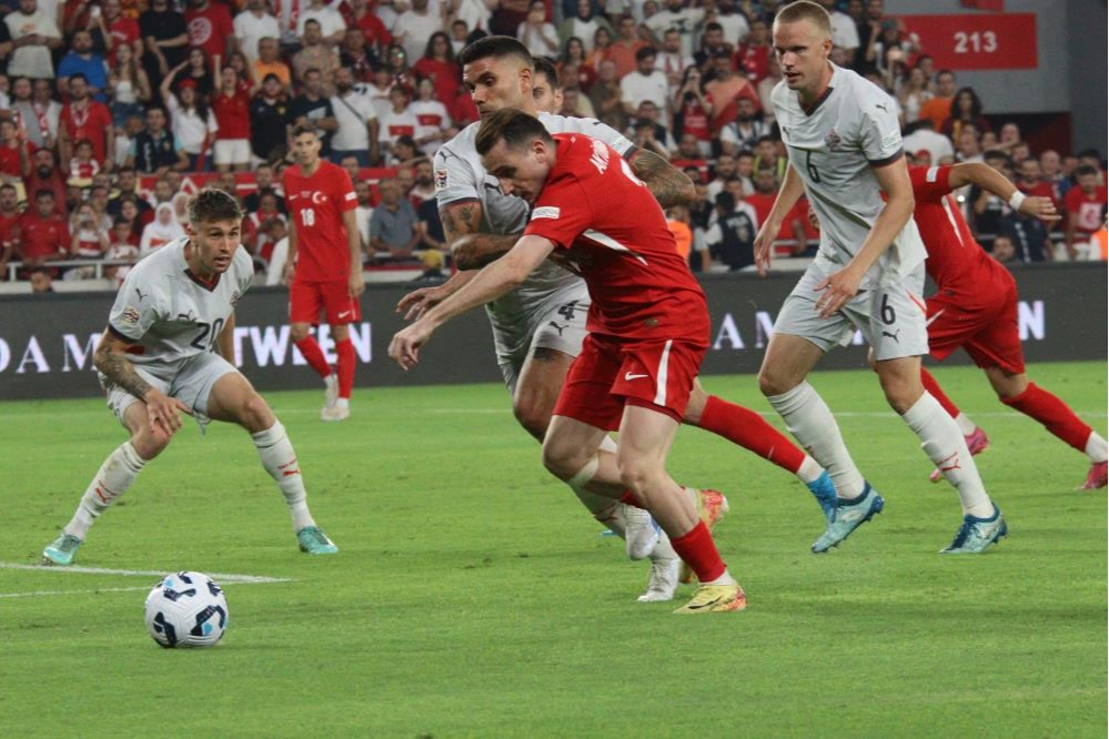 43. dakikada gelişen Türkiye atağında sol kanattan topla ceza sahasına giren Kerem Aktürkoğlu'nun şutu savunmadan sekerek az farkla kornere çıktı.