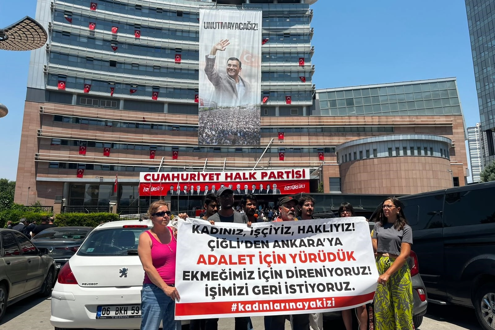 Grup adına açıklama yapan Hale Ören Özdinçer, şu ifadeleri kullandı: "Biz 10 Haziran 2024 tarihinde başkanlık seçimlerinden iki ay sonra 147 işçi olarak işten çıkartılan kadınlarız. O zamandan bugüne kadar hep Cumhuriyet Halk Partisi Genel Merkezi'ne seslendik, genel başkana seslendik. 'Sesimizi duyun, biz kadınız, ayakta kalma mücadelesi veriyoruz. Emeğimiz yok sayıldı. Kadınlara partinin davranışlarını biliyoruz. Lütfen bize de sesinizi çıkartın. Bizi sizsiz mahkum bırakmayın, işsizliğe mahkum bırakmayın' diye çok seslendik. Geçen sene de burada yaklaşık 21 gün eylem yaptık. O süre zarfında da Özgür Özel'le de görüşme fırsatını yakalamıştık. Kendisi bize belediye başkanımız ile görüşeceğini, bizi belediyelere en azından Çiğli olmasa da diğer belediyelere yerleştireceğini söylemişti. Biz de tamam deyip sustuk, beklemeye devam ettik. 15 Ağustos'ta da belediye başkanımız Çiğli'de direnen arkadaşlarımızla bir araya gelerek dediler ki, 'Eylemi bitirin. Ocak ayında sizi işinize geri alacağız.' Biz de tamam dedik. 'Başkanımızdır, söz vermiştir. Biz de bunu kabul ediyoruz' dedik. Eylemi bitirdik 15 Ağustos'ta. Ocak ayı geldiğinde biz tekrar belediye başkanımızla bir toplantı gerçekleştirdik. Toplantıda belediye başkanımız yeni kent lokantası açacağını, oralarda bizi değerlendireceğini söyledi. Ama biz de dedik yani biz çok kişiyiz. Ne kadar hepimizi birden değerlendirecek misiniz? Ya da işte aramızda üniversite mezunu, yüksek lisans mezunu, mühendis olan var. Öğretmen olan var. Onları da mı orada garsonluk yaparak değerlendireceksiniz dedik. O da yani 'Şu an için istihdam oluşturamadığımız için sekiz kişi, on kişiyi kent lokantalarını açtıkça sizi yerleştireceğim' dedi. Biz de tamam dedik ama tabii bunu kabul etmedik. Bunun neticesinde dışarıdan 20 kişi, 30 kişi peyderpey alınanlar oldu. O zaman biz de dedik ki birleşelim, 16 kadın birleştik. 1 Mayıs'ta İzmir Çiğli Belediyesi'nden Ankara genel merkezine kadar 10 gün boyunca 700 kilometre yol yürüdük biz. Bunun sonunda hala buradayız. Hala görüşme talebimiz var. Hala işimizi geri almak istiyoruz. Hala kadınız, haklıyız diyoruz. Hala bir cevap alamadık. 10 Mayıs'tan beri de buradayız. İşimizi geri alana kadar devam edeceğiz. Her gün buradayız. Her gün bu taştayız. Her gün bu pankartımızı açarak beklemeye devam edeceğiz."