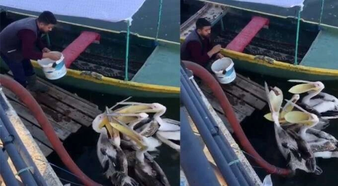 Bir vatandaşın cep telefonu kamerasına yansıyan görüntülerde, iskelede duran balıkçı 5 pelikana kovadan yem atarak besledi.