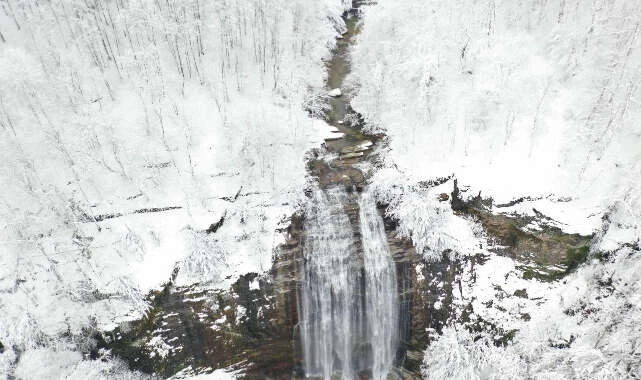 Bursa’nın Mustafakemalpaşa ilçesindeki Suuçtu Şelâlesi beyaza büründü. Şelâlenin beyaza bürünmüş haliyle havadan görüntüsü nefesleri kesti.
