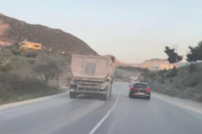 Hatay’da 120 kilometre hıza ulaşarak otomobil sollayan hafriyat kamyonunun trafiği tehlikeye soktuğu anlar kameraya yansıdı.