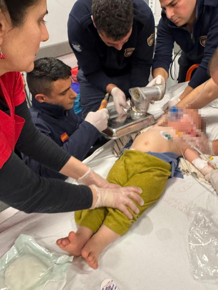 Antakya ilçesinde elini kıyma makinesine sıkıştıran 2 yaşındaki A.K.'nin ailesi durum üzerine evlatlarını Hatay Eğitim ve Araştırma Hastanesi’ne kaldırdı. Sağlık ekipleri durumu itfaiye ekiplerine bildirerek yardım istedi. İhbar üzerine hastaneye giden ekipler çocuğun elinin sıkıştığı kıyma makinesini kurtarmak için hastane yatağında çalışma başlattı. Ekiplerin titiz ve özenli çalışmalarının ardından kıyma makinesi çıkartıldı. Elinde kırık ve ezilme oluşan A.K.'ye sağlık ekipleri müdahale etti. Sağlık durumunun iyi olduğu öğrenilen çocuğun, annesi kıyma makinesini kullanırken elini kıyma makinesine soktuğu öğrenildi.