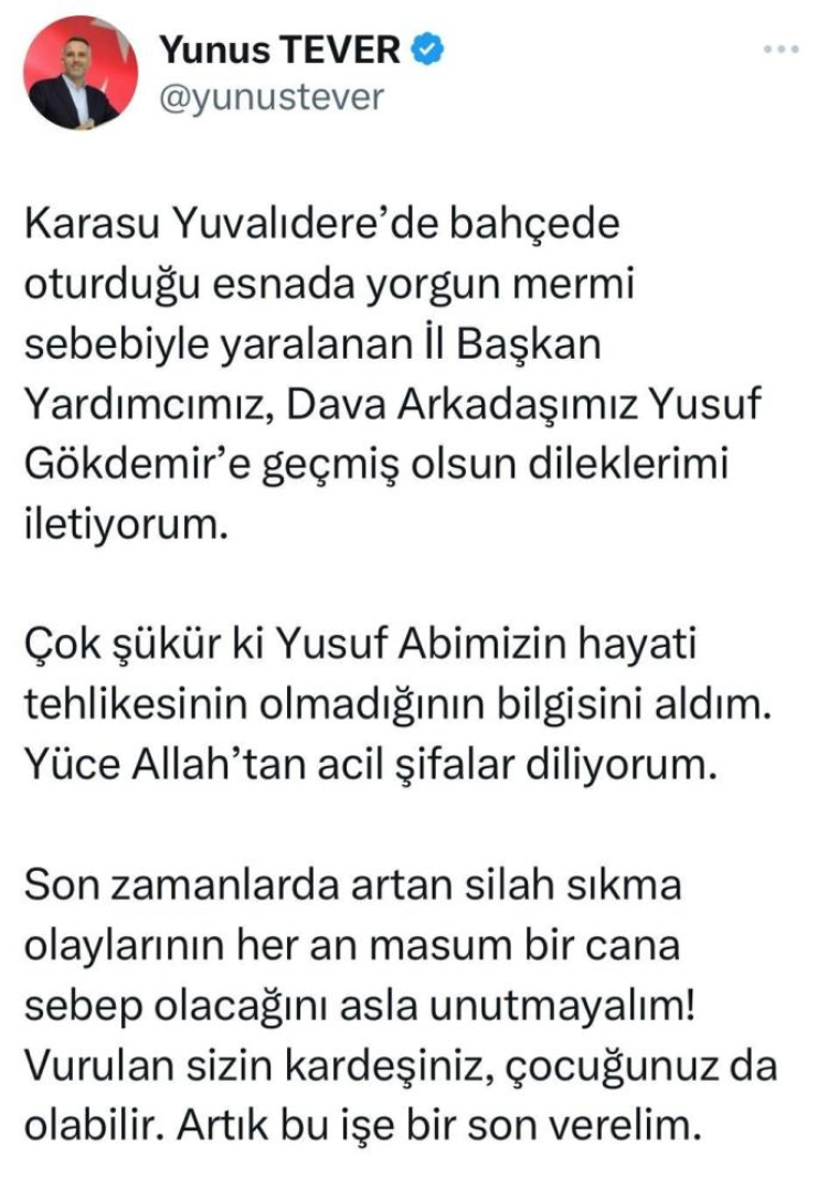 Konuya ilişkin olarak AK Parti Sakarya İl Başkanı Yunus Tever sosyal medyadan açıklamalarda bulundu. Tever, “Karasu Yuvalıdere’de bahçede oturduğu esnada yorgun mermi sebebiyle yaralanan İl Başkan Yardımcımız, dava arkadaşımız Yusuf Gökdemir’e geçmiş olsun dileklerimizi iletiyorum. Çok şükür ki Yusuf ağabeyimizin hayati tehlikesinin olmadığının bilgisini aldım. Yüce Allah’tan şifalar diliyorum. Son zamanlarda artan silah sıkma olaylarının her an masum bir cana sebep olacağını asla unutmayalım. Vurulan sizin kardeşiniz, çocuğunuz da olabilir. Artık bu işe bir son verelim” ifadelerini kullandı.