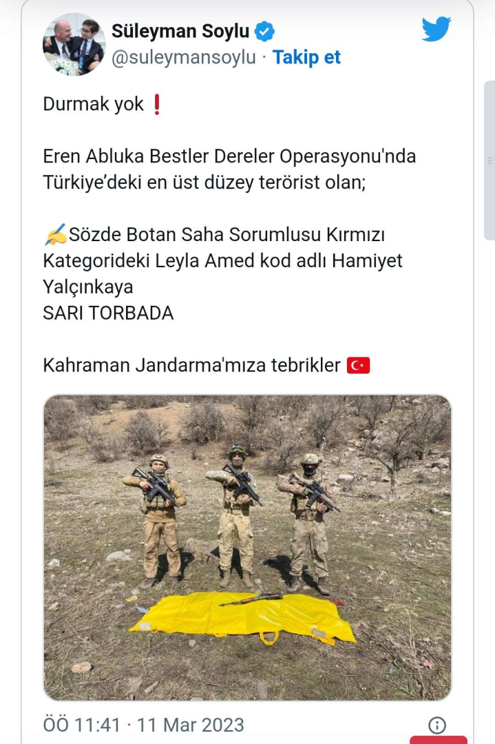 Soylu, "Durmak yok! Eren Abluka Bestler Dereler Operasyonu'nda Türkiye’deki en üst düzey terörist olan; Sözde Botan Saha Sorumlusu Kırmızı Kategorideki Leyla Amed kod adlı Hamiyet Yalçınkaya sarı torbada Kahraman Jandarma'mıza tebrikler" mesajını paylaştı.
