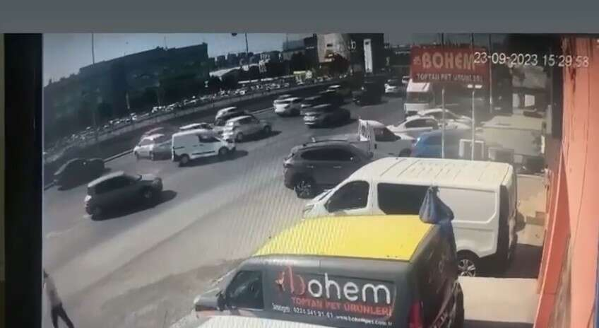 Frene basan sürücü kayan aracın kontrolünü kaybedince araç, otomobile çarptı. Savrulan otomobil de önündeki 2 araca vurarak durabildi. Kaza anı güvenlik kamerasına yansırken, kazada yaralanan olmadı.