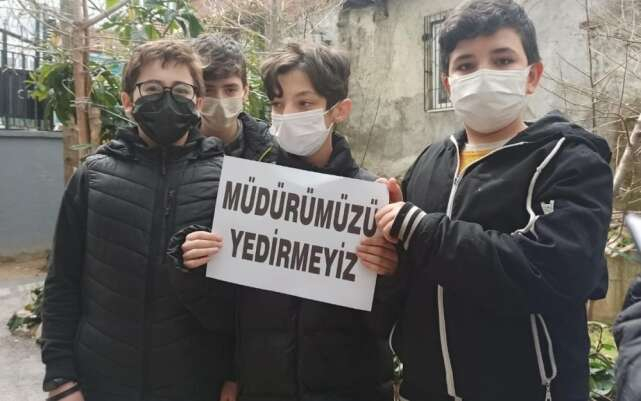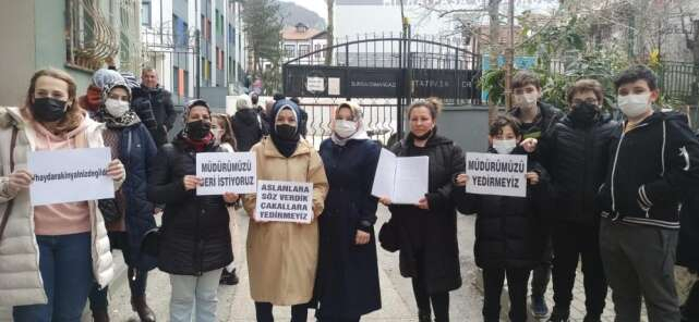 Okul önünde basın açıklaması yapan veliler ve eğitimciler "Müdürümüzü çakallara yem etmeyiz, müdürümüzü geri istiyoruz" şeklinde pankart açıp slogan attı.