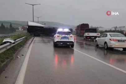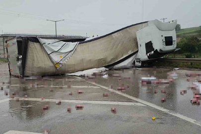 Kaza, saat 07.00 sıralarında Mustafakemalpaşa Terminal Kavşağı’nda meydana geldi. Bursa istikametine seyir halinde olan H.B idaresindeki tır, yağış etkisiyle kayganlaşan yolda sürücünün kontrolünden çıkarak önce bariyere çarptı ardından yola devrildi. Tırın dorsesinde bulunan çok sayıda alkol yola saçıldı. Tır şoförü kazadan yara almadan kurtulurken, trafik kısa süreliğine durma noktasına geldi. Ekiplerin müdahalesiyle yol bir süre sonra tek şeritten kontrollü olarak trafiğe açıldı. Olayla ilgili tahkikat başlatıldı.