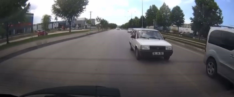 Bursa'nın Osmangazi ilçesi İzmir Yolu Caddesi üzerinde ilerleyen TOFAŞ marka bir otomobilin sürücü iki aracın arasından geçmek isteyince gaza yüklendi. Makas atarak giden otomobil kazayı teğet geçince, diğer sürücüler korna çalarak tepki gösterdi. Ölümüne makas atan sürücü ise araç içi kamerasıyla saniye saniye görüntülendi.