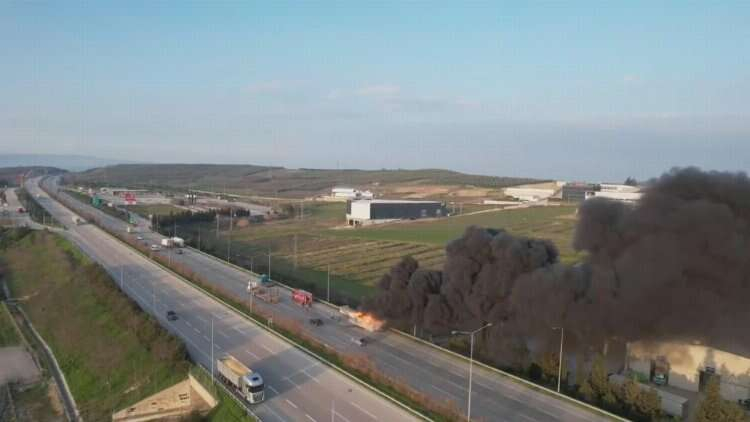 Bursa'da devrilen TIR'ın dorsesi alev alev yanarken o anlar dron ile görüntülendi.