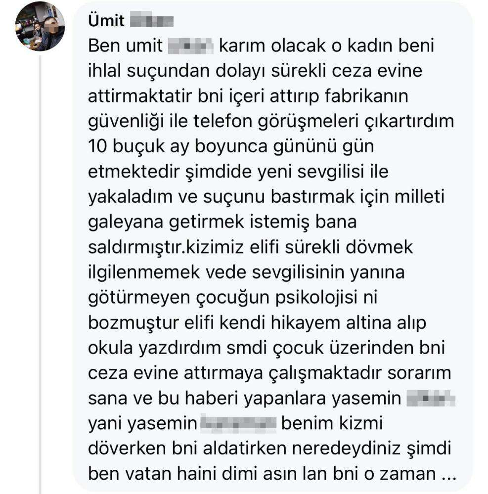 Yakalanan şüpheli Ümit Ü. Sosyal medya hesabından şu ifadeleri kullandı: "Karım olacak o kadın beni ihlal suçundan dolayı sürekli ceza evine attırmaktadır. Beni içeri attırıp fabrikanın güvenliği ile telefon görüşmeleri çıkartırdım 10 buçuk ay boyunca gününü gün etmektedir şimdide yeni sevgilisi ile yakaladım ve suçunu bastırmak için milleti galeyana getirmek istemiş bana saldırmıştır. Kızımı kendi himayem altına alıp okula yazdırdım şimdi çocuk üzerinden beni ceza evine attırmaya çalışmaktadır sorarım sana ve bu haberi yapanlara Yasemin Ü. yani benim kızımı döverken beni aldatırken neredeydiniz şimdi ben vatan hainiyim di mi asın lan beni o zaman".