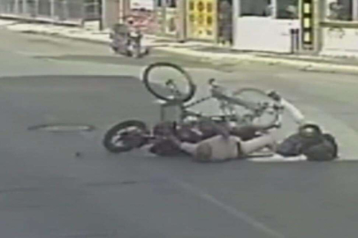 Bursa'nın İnegöl ilçesinde meydana gelen kazada motosiklet ile çarpışan bisikletin sürücüsü yaralandı. Kaza anı bir iş yeri güvenlik kameralarına saniye saniye yansıdı.