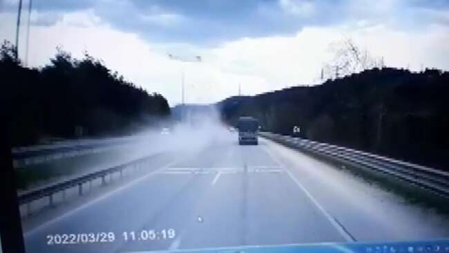 Arkasından seyreden araçlar ise durmayı başarırken; bu anlar bir aracın kamerasına saniye saniye yansıdı. Şans eseri kazada ölen ya da yaralanan olmadı. Trafik ekiplerinin çalışmasıyla karayolu bir süre sonra trafiğe iki şeritten de açıldı.