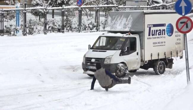 Gece saatlerinde etkisini arttıran kar Bursa’yı beyaza bürüdü. Yollar karla kaplanırken araç sürücüleri ve vatandaşlar zor anlar yaşadı. Dışarıya çıkan vatandaşlar karlı kaplı yollarda düşe kalka yolculuk yaptı. Çok sayıda vatandaşın kayarak düştüğü anlar kameralar tarafından saniye saniye görüntülendi. Karlı yolda kayarak yere sert şekilde düşen çok sayıda vatandaş şans eseri yara almadan kurtuldu.