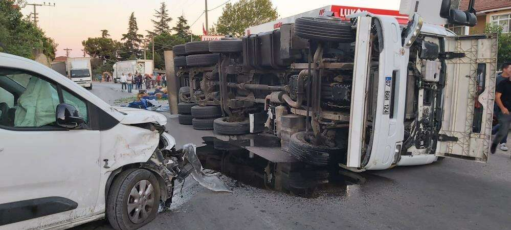 Bursa’nın İznik ilçesinde virajı alamayan tır önce araçlara çarptı sonra devrildi. Kaza anı güvenlik kamerasına yansıdı.