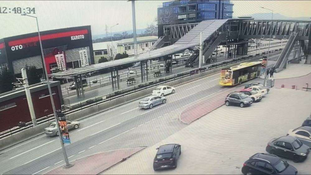 Bursa'da belediye otobüsünün bariyerlere çarpması sonucu 5 kişinin yaralandığı kaza, bir iş yerinin güvenlik kamerasına yansıdı.