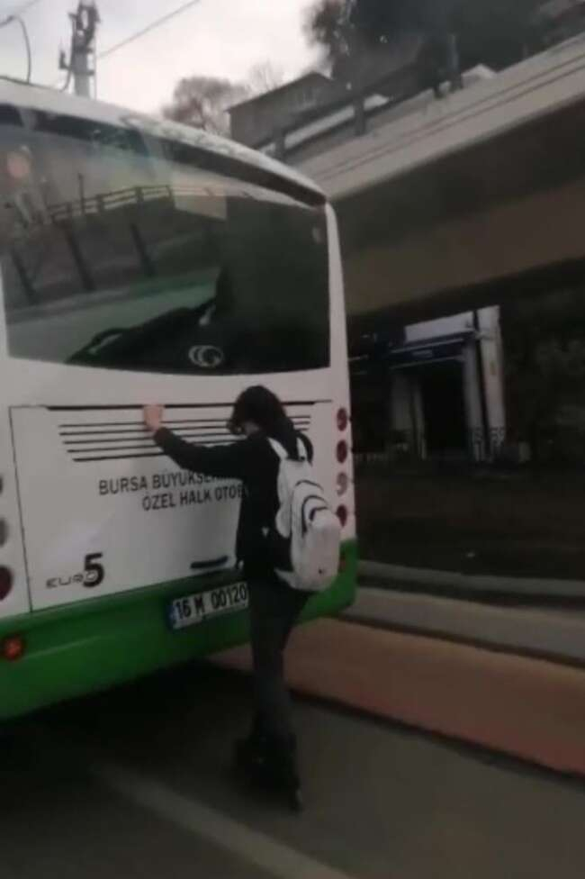 Bursa'nın en işlek caddelerinden biri olan Altıparmak caddesinde patenli bir gencin otobüsün arkasına tutunarak yaptığı tehlikeli yolculuk kameraya yansıdı. Sürücülerin tepkilerine rağmen tehlikeli yolculuğa devam eden genç pes dedirtti.