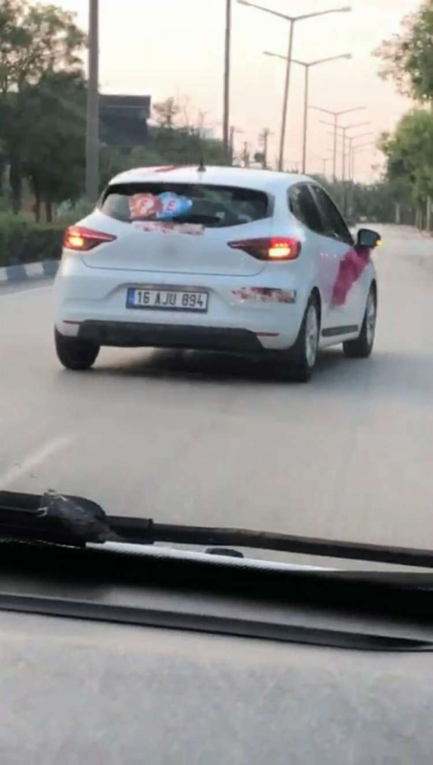 Bursa’da düğün konvoyunda ilerleyen araçların, arkasında seyreden araca yol vermeyerek trafiği tehlikeye düşürdüğü anlar kameraya yansıdı.