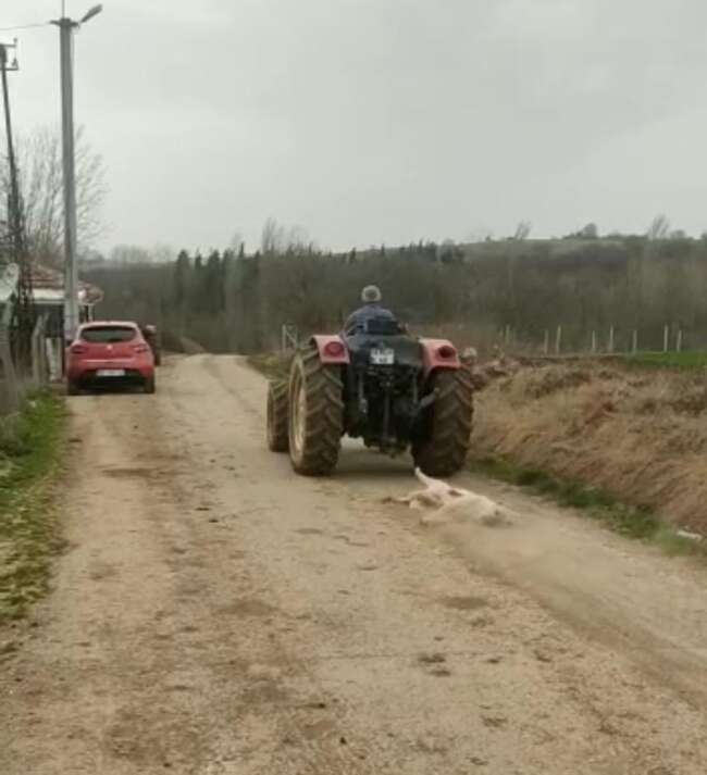 Bursa'nın İnegöl ilçesi kırsal Şehitler Mahallesinde meydana gelen olayda Rauf Halil B.(60), tavuklarını yediğini iddia ettiği hamile olan köpeği av tüfeği öldürüp, traktörünün arkasına bağladığı iple sürükledi. O anlar amatör kameraya yansıdı.
