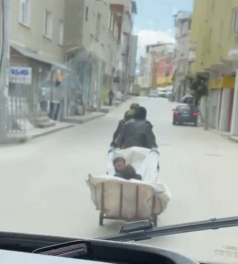 Bursa'da motosiklete bağladıkları çekçek arabasının içinde çocuklarını tehlikeye aldırmadan taşıyan aile yürekleri ağza getirdi.