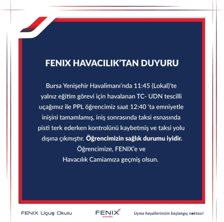 FENIX Uçuş Okulu tarafından yapılan yazılı açıklamada: "Bursa Yenişehir Havalimanı'nda 11:45'te yalnız eğitim görevi için havalanan TC-UDN tescilli uçağımız ile PPL öğrencimiz saat 12:40 'ta emniyetle inişini tamamlamış, iniş sonrasında taksi esnasında pisti terk ederken kontrolünü kaybetmiş ve taksi yolu dışına çıkmıştır. Öğrencimizin sağlık durumu iyidir. Öğrencimize, FENIX'e ve Havacılık Camiamıza geçmiş olsun" ifadelerine yer verildi. Öğrencinin sağlık durumunun iyi olduğu öğrenildi.