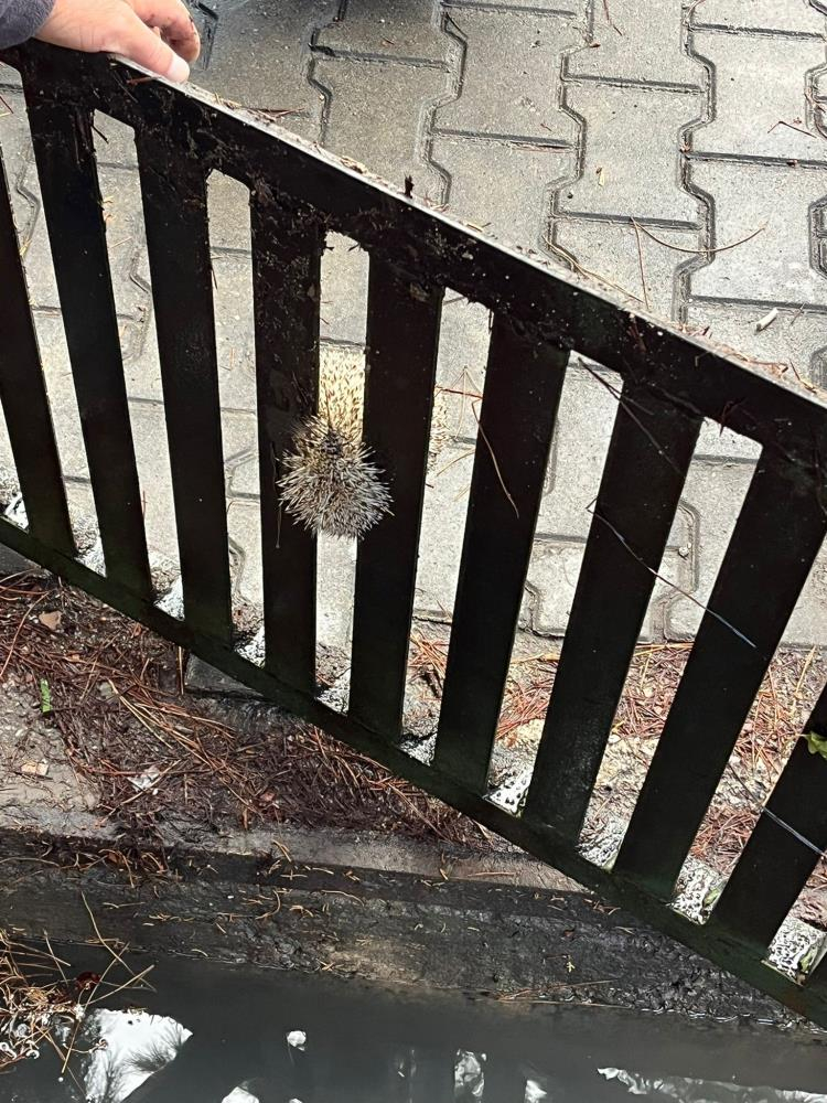 Balıkesir'in Burhaniye ilçesinde bir yağmur gideri mazgalına sıkışan kirpi, itfaiye ekiplerinin titiz çalışması sonucu kurtarıldı.