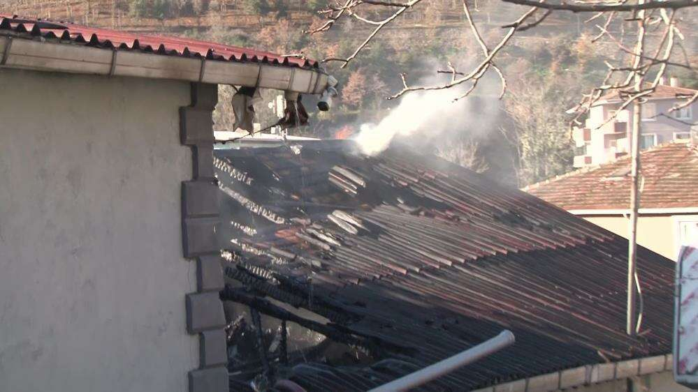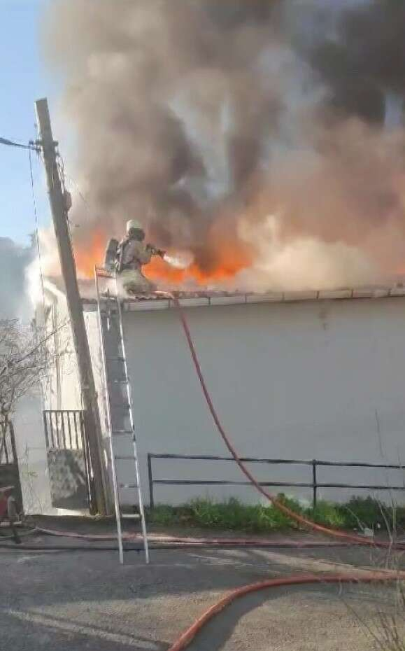 Öte yandan, evin çatısının alev alev yandığı anlar cep telefonu kamerasına yansıdı. Görüntülerde evin çatısı alevler içinde yanıyor. İtfaiye eri de merdivenlere tırmanıp çatıya çıkıyor ve yangına müdahale ediyor.