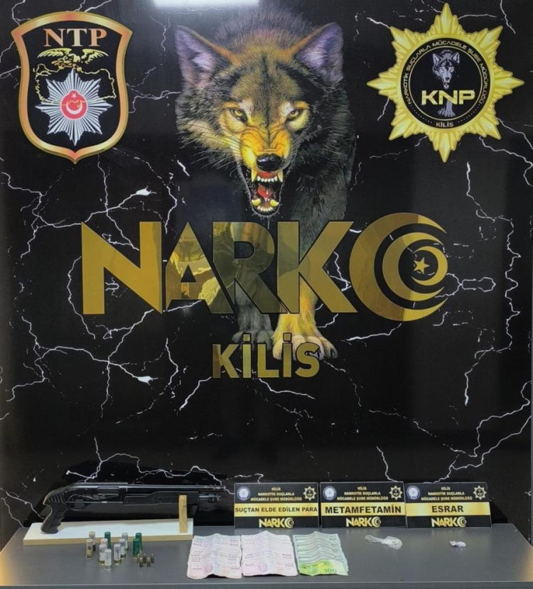 Evde devam eden aramalarda ise 3.49 gram metamfetamin, 1.51 gram esrar, 1 pompalı tüfek, 11 kartuş, 5 fişek ve 2 cep telefonu bulundu.