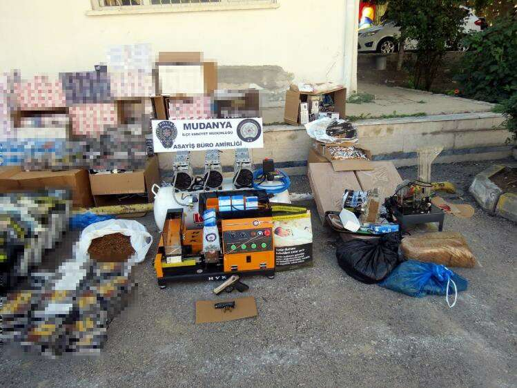 Mudanya Emniyeti Asayiş Büro ekiplerinin eş zamanlı yaptıkları baskınlar sonucu kaçak olarak satışı ve imalatı yapılan tütün ve tütün mamulü imalatında kullanılan teçhizatlar ve ruhsatsız bir adet tabanca ele geçirildi.