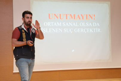 Teknolojinin hızla geliştiği günümüzde internet ve sosyal medya kullanımında dikkat edilmesi gereken hususlara değinerek, özellikle gençlerin karşılaşabileceği siber tehditler hakkında bilgiler veren Polis Memuru Sami Sarıkaya, "Siber suçların, fiziksel olarak işlenen tehdit, şantaj, gasp gibi suçlardan hiçbir farkı yoktur." sözleriyle dijital suçların ciddiyetine dikkat çekti.