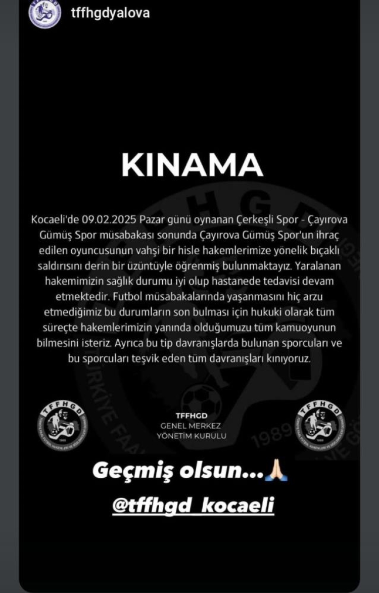 Yaşanan kesici aletle yaralama olayının ardından Türkiye Faal Futbol Hakemleri ve Gözlemcileri Derneği (TFFHGD) Kocaeli Şubesi'nden açıklama yapıldı. Açıklamada, "Kocaeli'de 09.02.2025 Pazar günü oynanan Çerkesli Spor- Çayırova Gümüş Spor müsabakası sonunda Çayırova Gümüş Spor'un ihraç edilen oyuncusunun vahşi bir hisle hakemlerimize yönelik bıçaklı saldırısını derin bir üzüntüyle öğrenmiş bulunmaktayız. Yaralanan hakemimizin sağlık durumu iyi olup hastanede tedavisi devam etmektedir. Futbol müsabakalarında yaşanmasını hiç arzu etmediğimiz bu durumların son bulması için hukuki olarak tüm süreçte hakemlerimizin yanında olduğumuzu tüm kamuoyunun bilmesini isteriz. Ayrıca bu tip davranışlarda bulunan sporcuları ve bu sporcuları teşvik eden tüm davranışları kınıyoruz" ifadelerine yer verildi.