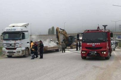 Bilecik'te iş makinesi taşıyan tırın dorsesinde çıkan yangın maddi hasara neden oldu.