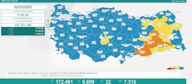 Sağlık Bakanlığı'nın 10 Nisan'a ilişkin koronavirüs verilerine göre; son 24 saat içerisinde yapılan 172 bin 461 testten 5 bin 609'u pozitif çıktı. Virüs nedeniyle 32 kişi daha hayatını kaybetti. İyileşen hasta sayısı 7 bin 315 olarak açıklandı.