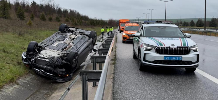 Edirne-Kırklareli otoyolunda yağışın etkisiyle kontrolden çıkarak takla atan otomobilde bulunan kişiler yara almadan kurtuldu.
