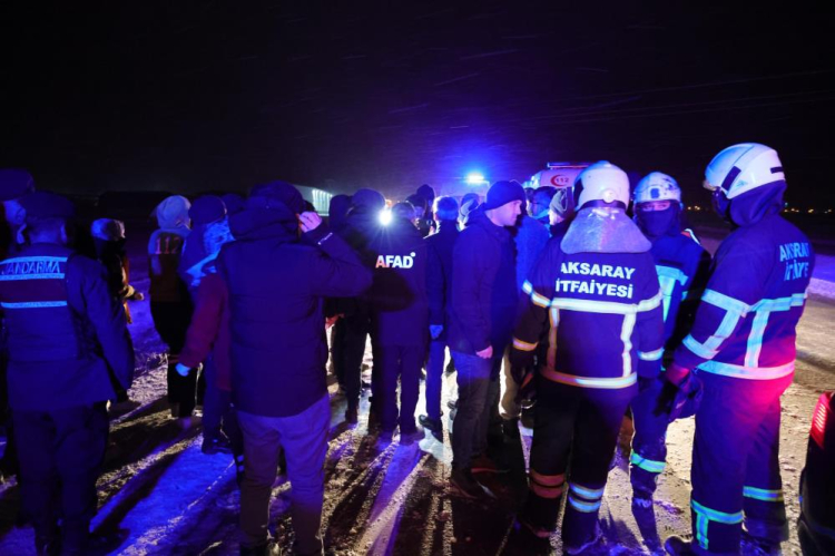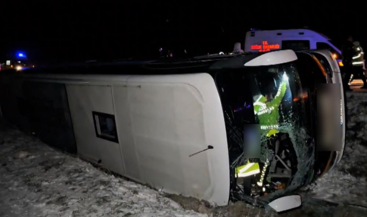 Aksaray'da yoğun kar yağışı ve buzlanma nedeniyle kayan yolcu otobüsü kontrolden çıkarak şarampole devrilirken kazada 20 yolcu yaralandı.