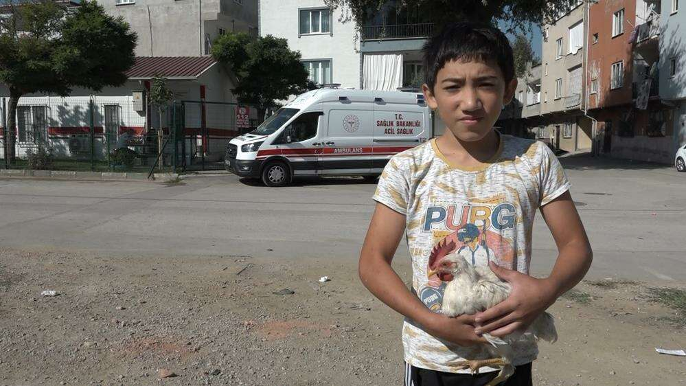 Dışarı çıkan sağlık çalışanları, karşı kapı komşuları Uğurcan Felamur’un elinde yaralı tavuğu görünce gözlerine inanamadı. Çitlerden atlarken ayağını tellere taktırarak yaralanan tavuk, sahibinin elinden alınarak ambulansta müdahale edildi.