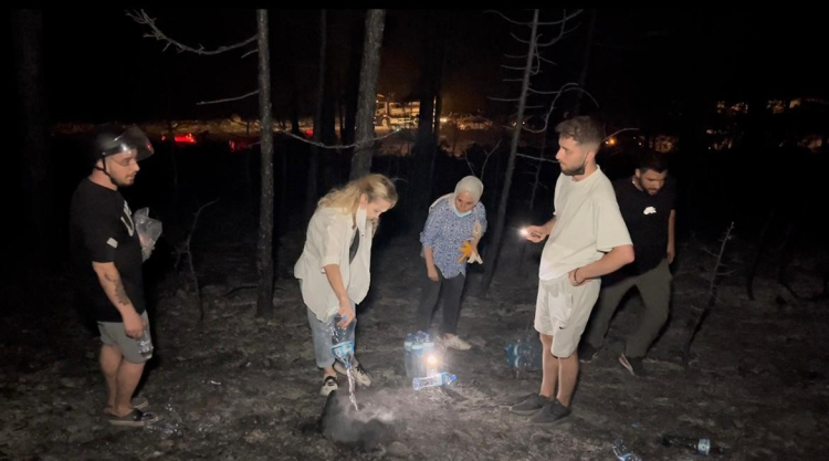 Yangın bölgesinde ormanlık alanda zaman zaman çıkan alevlere müdahale eden isimlerden biri de İbrahim Tatlıses’in eski eşi Ayşegül Yıldız oldu. İHA muhabirinin kadrajına yansıyan Yıldız, alevlere su dökerek müdahale etti.