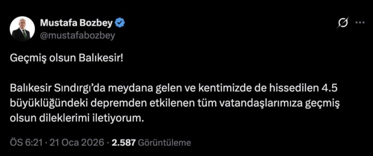 Bursa Büyükşehir Belediye Başkanı Mustafa Bozbey, "Balıkesir Sındırgı'da meydana gelen ve Bursa'da da hissedilen 4.5 büyüklüğündeki depremden etkilenen tüm vatandaşlarımıza geçmiş olsun. Gelişmeleri yakından takip ediyoruz" dedi.