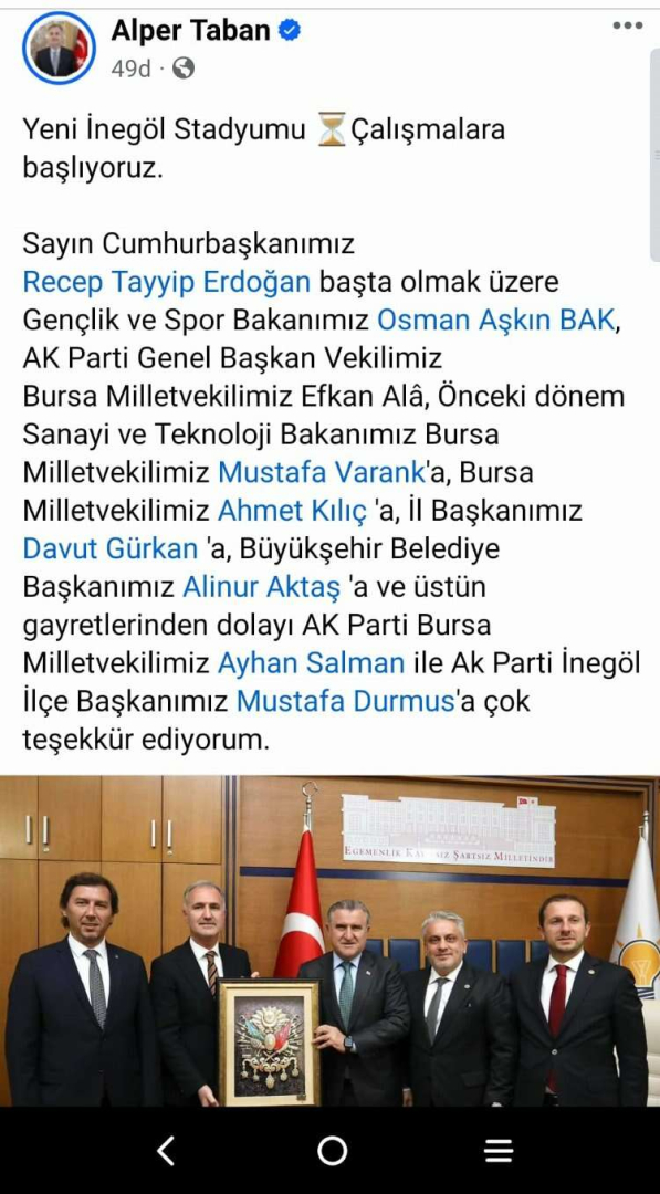İnegöl Belediye Başkanı Alper Taban sosyal medya hespalarından 'Yeni İnegöl Stadyumu' hakkında şu paylaşımı yaptı.