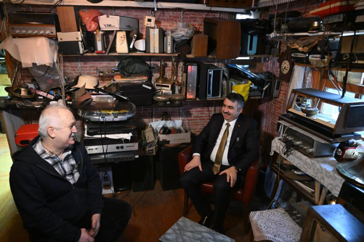 Yıldırım Belediye Başkanı Oktay Yılmaz, Bursa'da Yeşil Caddesi’ndeki atölyesinde 40 yıldır eski radyo ve gramofonları tamir edip çalışır hale getiren son usta 'Nostalji Doktoru' olarak tanınan Ahmet Ali Şağın’ın (63) misafiri oldu. Şağın ile sohbet eden Başkan Oktay Yılmaz, atölyede bulunan radyo, gramofon ve müzik dolaplarını inceledi.